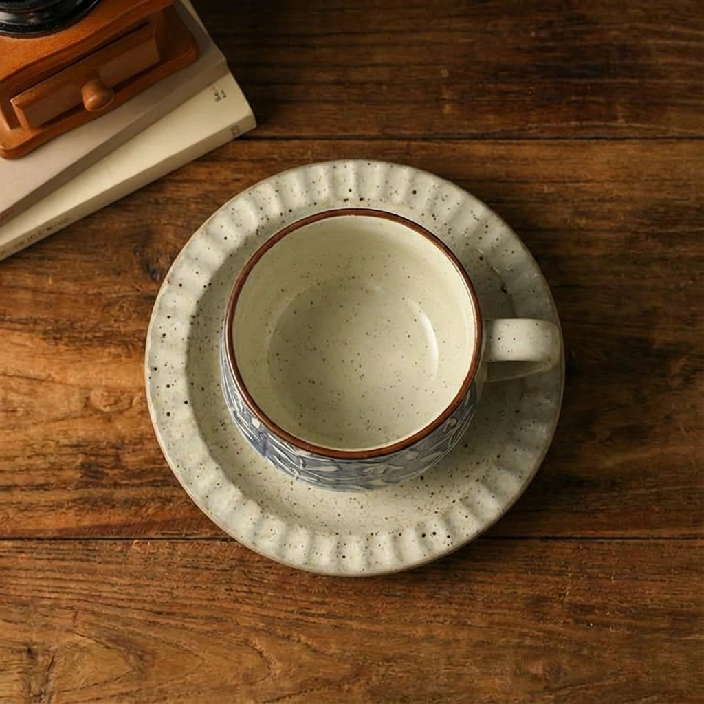 This charming set features a graceful, swirling vine pattern inspired by traditional ‘Tangcao’ art, rendered in deep indigo and warm russet tones.Crafted with care, the design is applied using an underglaze technique, permanently sealing the artwork beneath a smooth, glossy finish for lasting beauty and durability.