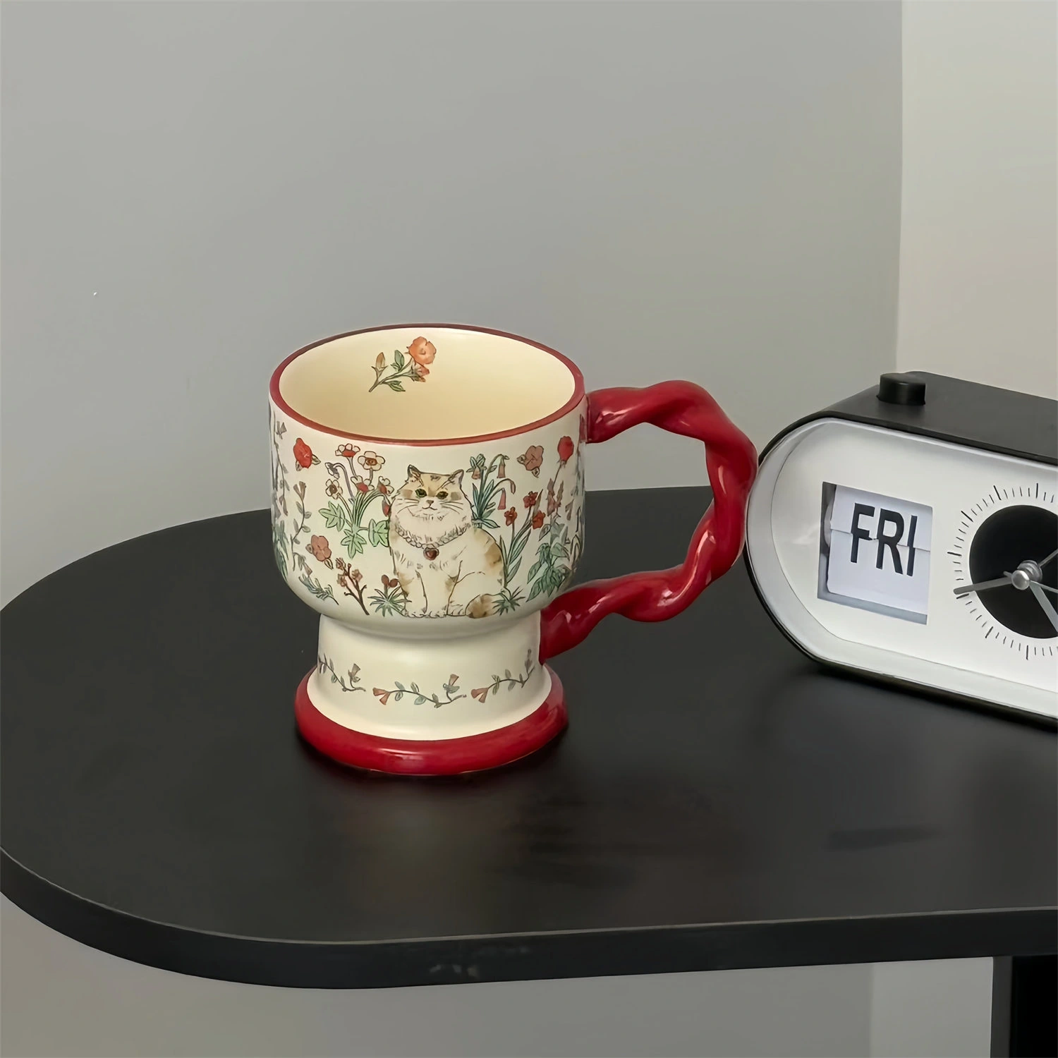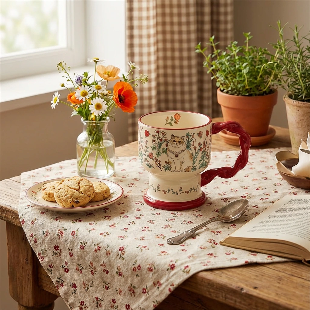 Greet the day with a friend. This mug captures a quiet moment in a wildflower patch, where a contented cat waits to share your morning coffee or tea. Its sturdy pedestal base and playful, twisted red handle feel just right in your hands, bringing a bit of storybook charm to your daily routine.