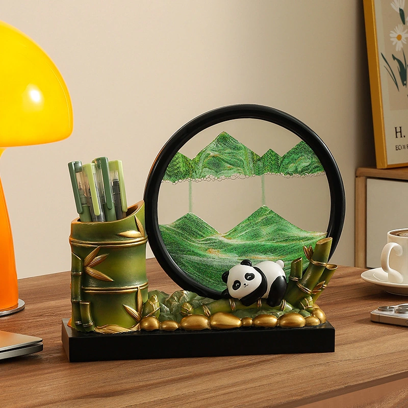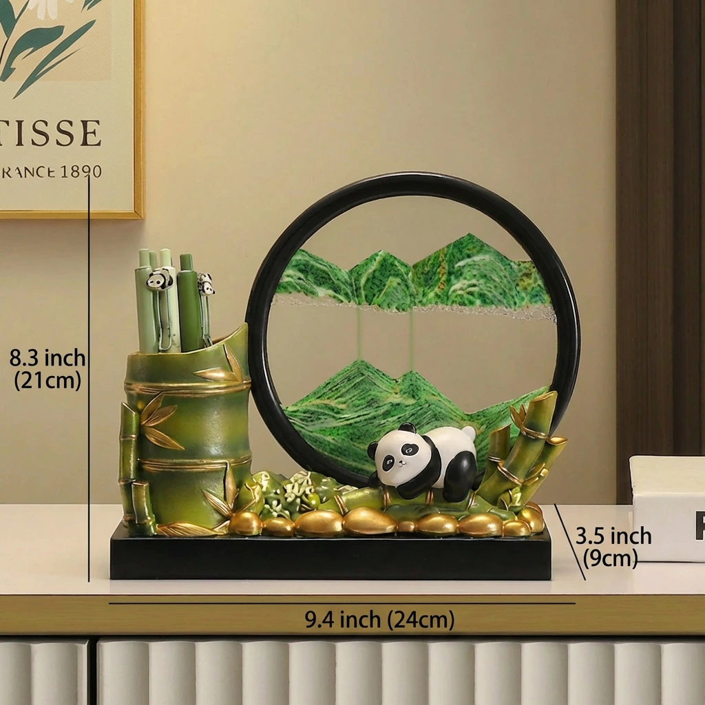 Watch as emerald dunes drift and shift, creating a new mountain vista with every turn. A playful panda pauses on its journey through a golden-accented bamboo grove, a quiet companion to your moments of focus. This piece is more than just a desk accessory; it’s a small, tranquil world, offering a peaceful escape. Keep your pens nestled in the bamboo stalks and let your mind wander to quiet, green landscapes.