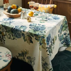 Inspired by classic botanical prints, our Delft Rose tablecloth brings timeless romance to your table. Serene blue roses bloom across a soft ivory background, creating a scene of quiet elegance for everyday meals and special gatherings alike.