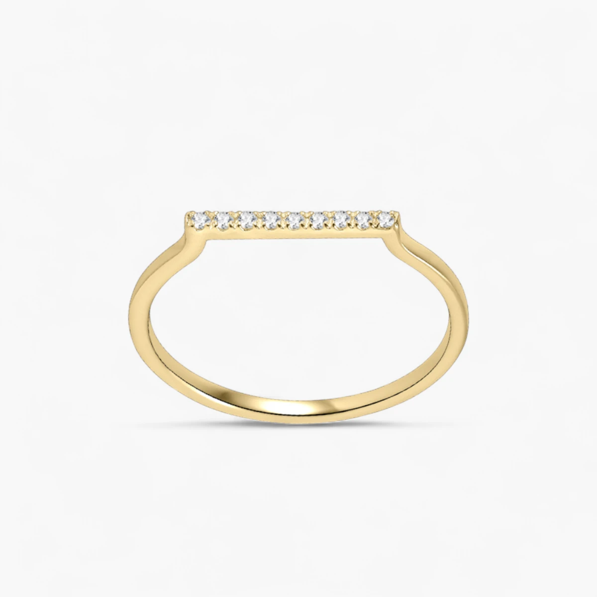 A timeless piece with a modern twist, designed for those who appreciate both elegance and sustainability. This moissanite bar ring features a row of brilliant, ethically sourced moissanites, set in a sleek sterling silver band plated with 14k gold. Crafted with care, it offers the perfect balance of luxury and value, making it a sparkling choice for any occasion.
