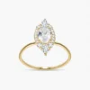 This delicate and intricate pear-cut moissanite cluster ring features a sterling silver base plated with 14K gold, beautifully showcasing a sophisticated and refined design. Each moissanite stone is meticulously cut, and the delicate pear shape and cluster design make this ring both modern and elegant. It’s perfect for everyday wear or special occasions. The 14K gold plating process not only enhances the ring’s shine but also provides better durability, preventing color fading.