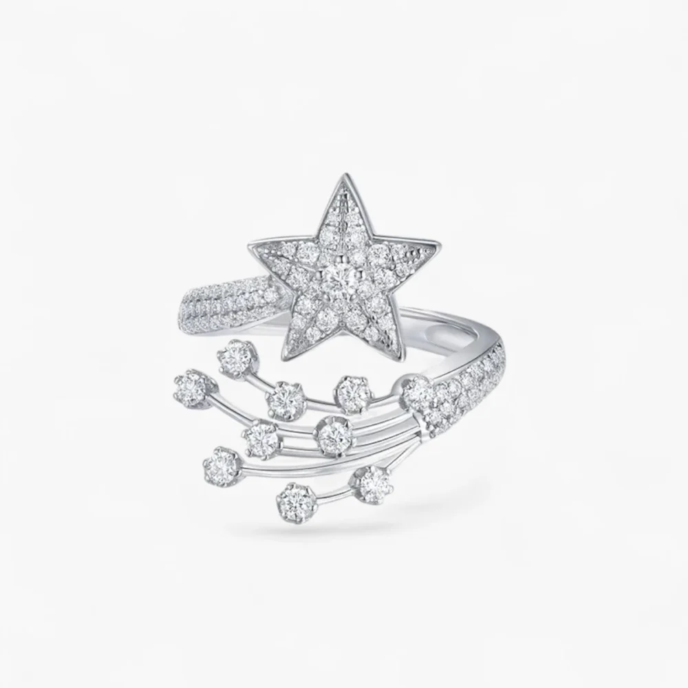This exquisite statement ring, inspired by the brilliance of shooting stars, features over 50 moissanite stones in varying sizes, each set meticulously into a stunning silver band. Its intricate and luxurious design makes it a standout piece that captures the essence of celestial elegance.